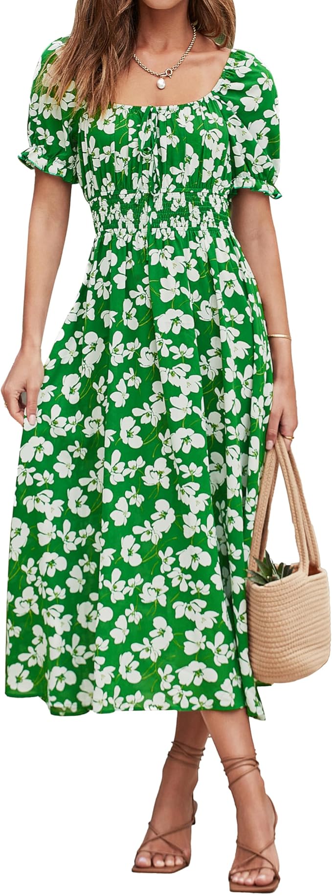 Women Summer Casual Square Neck Short Sleeve Smocked Waist A-Line Midi Dresses Boho Floral Print Beach Dress