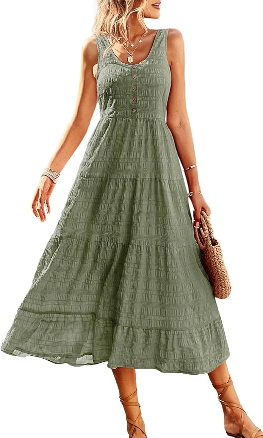 Women's Casual Summer Dress Loose Sleeveless Tank Dresses Smocked Tiered Flowy Midi Sundress with Pockets