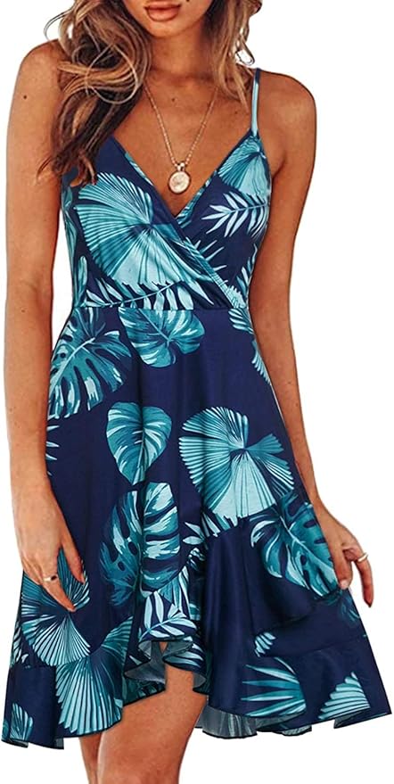 Women's Summer Dresses 2024 Spring Floral V Neck Adjustable Spaghetti Casual Beach Outfits Clothes Flowy Wrap Dress