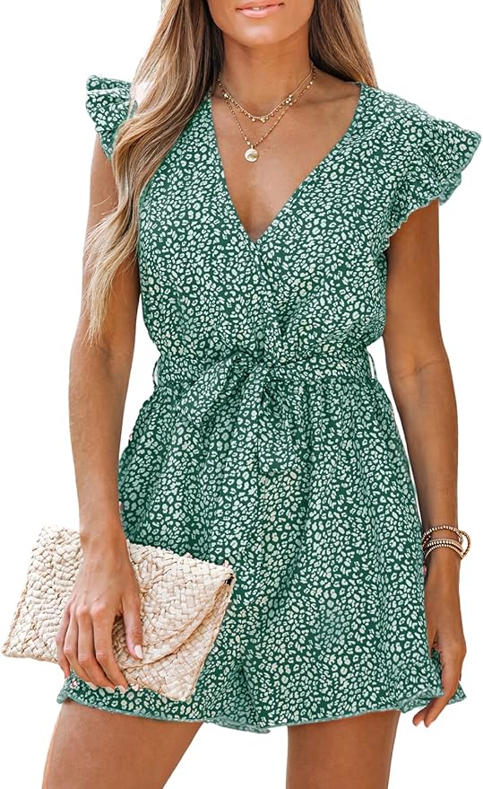 Women's V Neck Floral Print Belted Elastic Waist Romper Ruffled Cap Sleeves Mini Jumpsuit