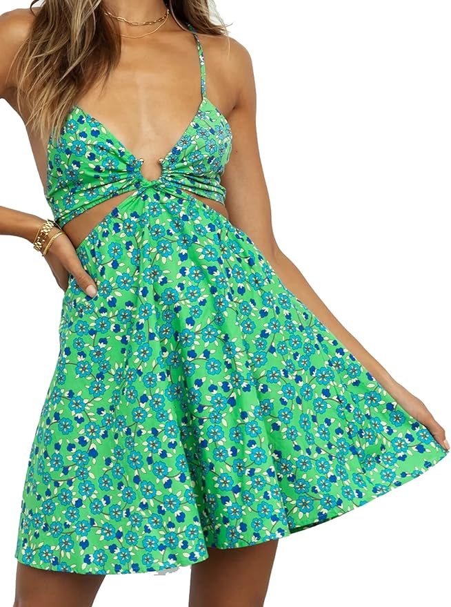 Womens Summer Floral V Neck Adjustable Spaghetti Casual Short Dress with Ring