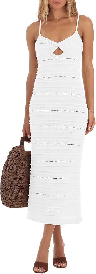 Womens Crochet Knit Dress Summer Casual Sleeveless V Neck Spaghetti Strap Twist Midi Sweater Dresses
