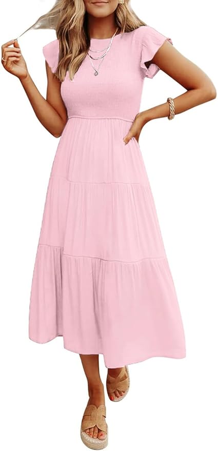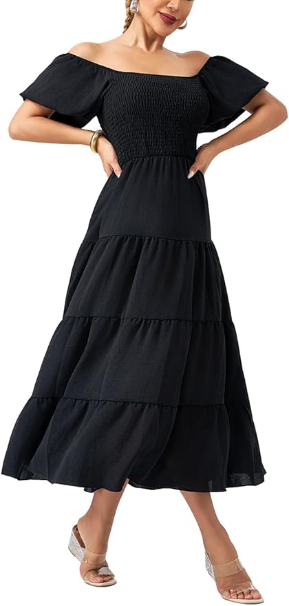 Women Summer Casual Midi Dress Square Neck Puffy Short Sleeve Smocked Tiered Ruffle Dress