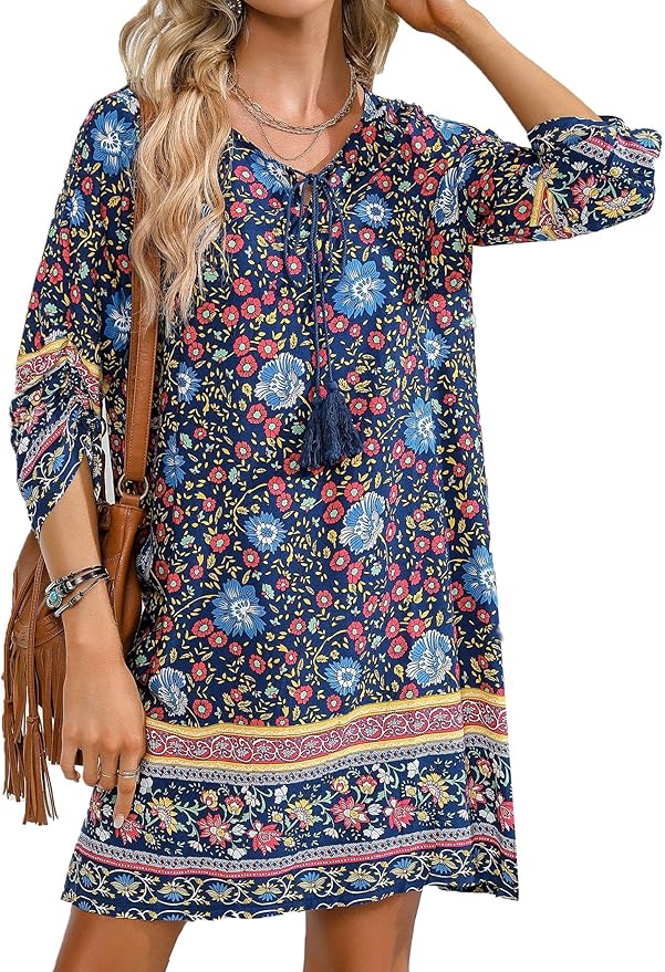 Women Casual Beach Summer Dress Boho Tassel Tie Neck 3/4 Long Sleeve Short Floral Print Flowy Cover Up Sundresses