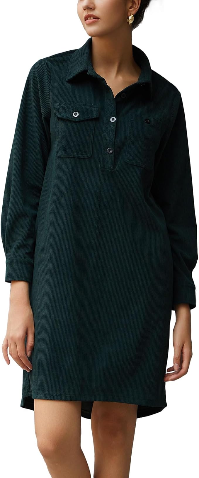 Women's Tunic Dress Long Sleeve Casual Button Down Corduroy Shirt Dress with Pockets