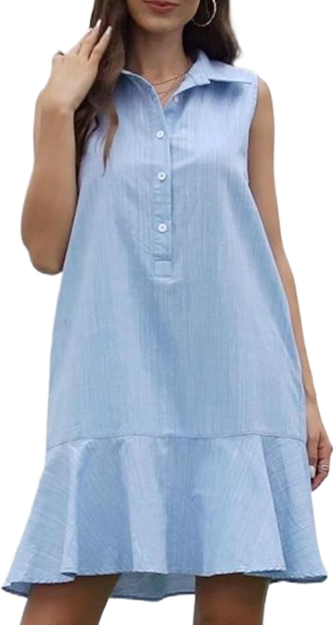 Women Sleeveless Mini Dress Button Down Shirt Dress V Neck Reffle Hem Cotton Linen Tunic Short Dress