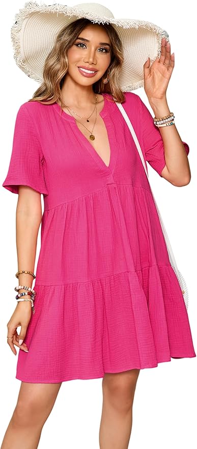 Womens Summer Cotton Flowy Mini Dress V Neck Short Sleeve Boho Ruffle Tiered Casual Loose Tunic Dress