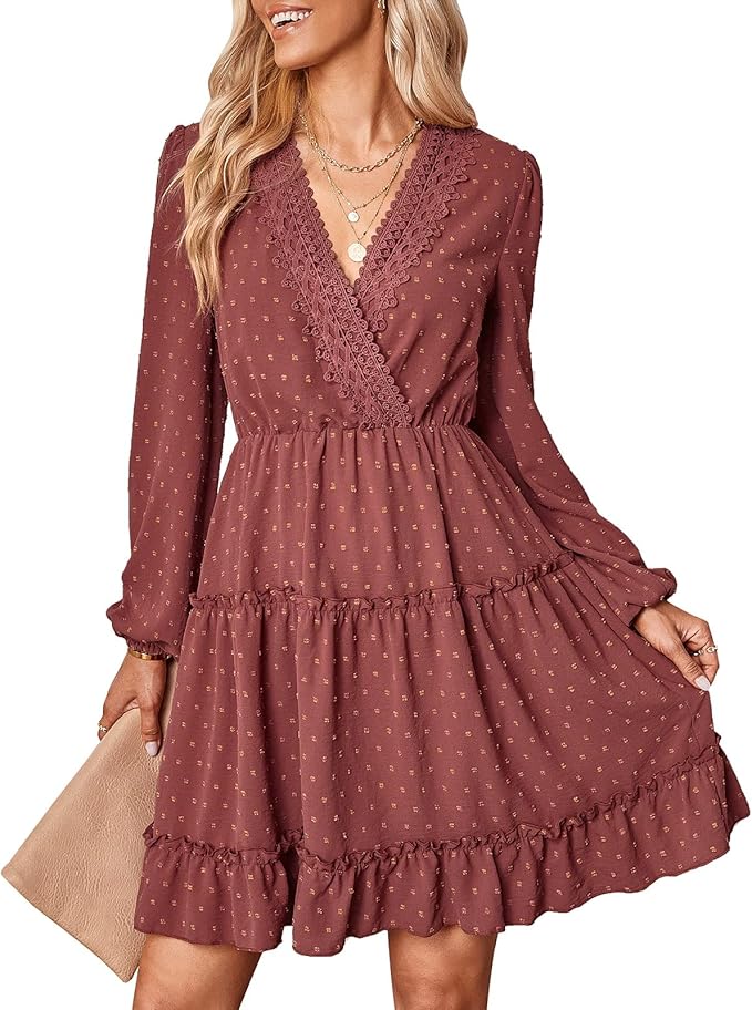 Womens 2023 Spring Summer Wrap V Neck Swiss Dot Long Sleeve Mini Dress