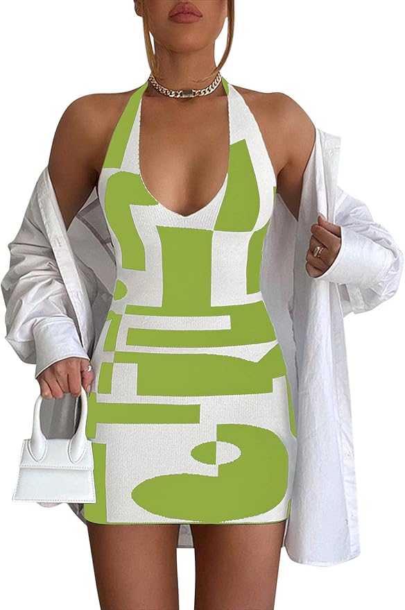 Women’s Halter Neck Sleeveless Bodycon Dress Sexy Deep V Neck Backless Bandage Summer Casual Mini Dress